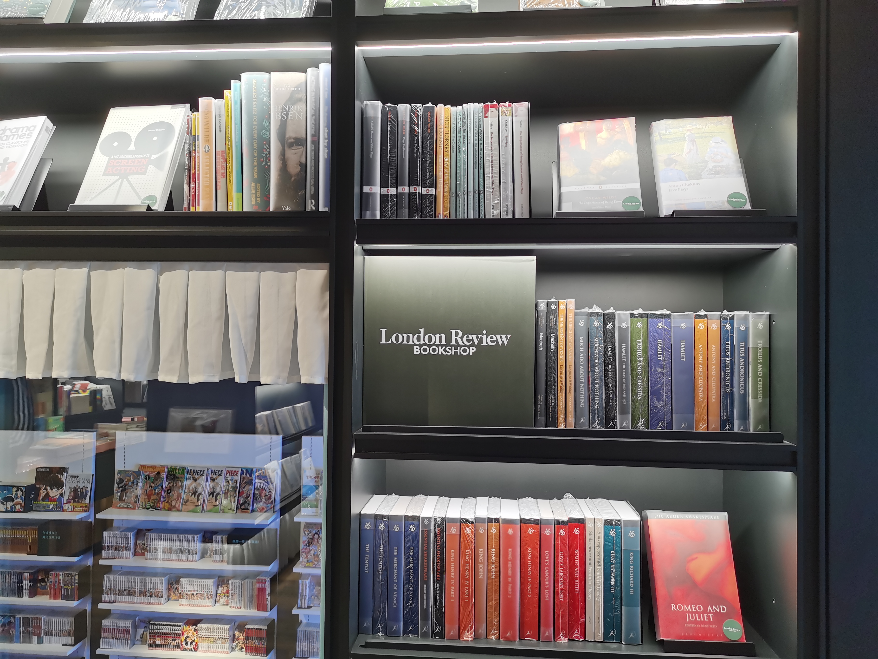 书店内也设置了伦敦书评书店专区和豆瓣专区。伦敦书评书店专区精选了与戏剧、电影相关的图书600余种,书架上可见莎士比亚、契诃夫、易卜生以及贝克特的经典剧作,读者也可以在此直接购买外版图书。豆瓣专区摆放了“戏剧”“电影”标签下评分最高的图书近300种,包括老舍和曹禺的名作以及《阿瑟·米勒手记》等。此外,朵云书院·戏剧店还首次开辟动漫专区,选取包括“漫威系列”《惊奇队长》《奇异博士》《蚁人》、“星际争霸”系列在内的1000余种图书,读者还可以在店内发现各类动漫手办。