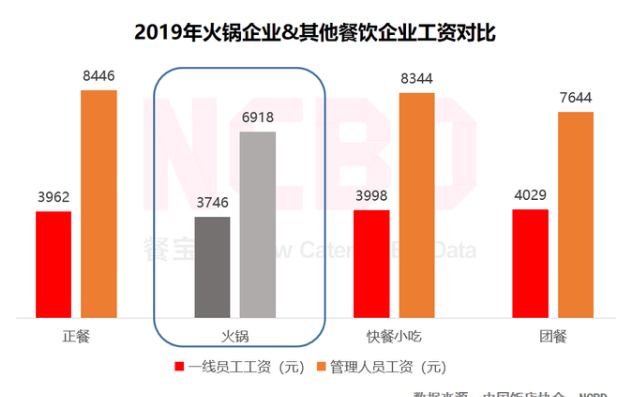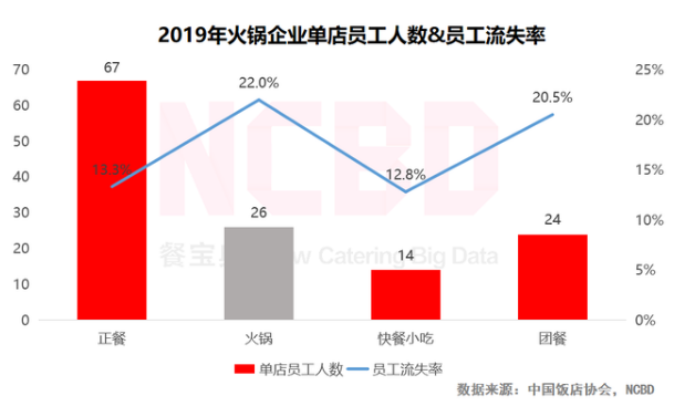 值得注意的是,报告在预计中国火锅市场规模的同时,也对火锅企业与其他餐饮企业的薪资进行了对比。与正餐、快餐小吃和团餐相比,火锅行业一线员工与管理人员平均工资最低,员工流失率最高,达到22%,远超其他品类。