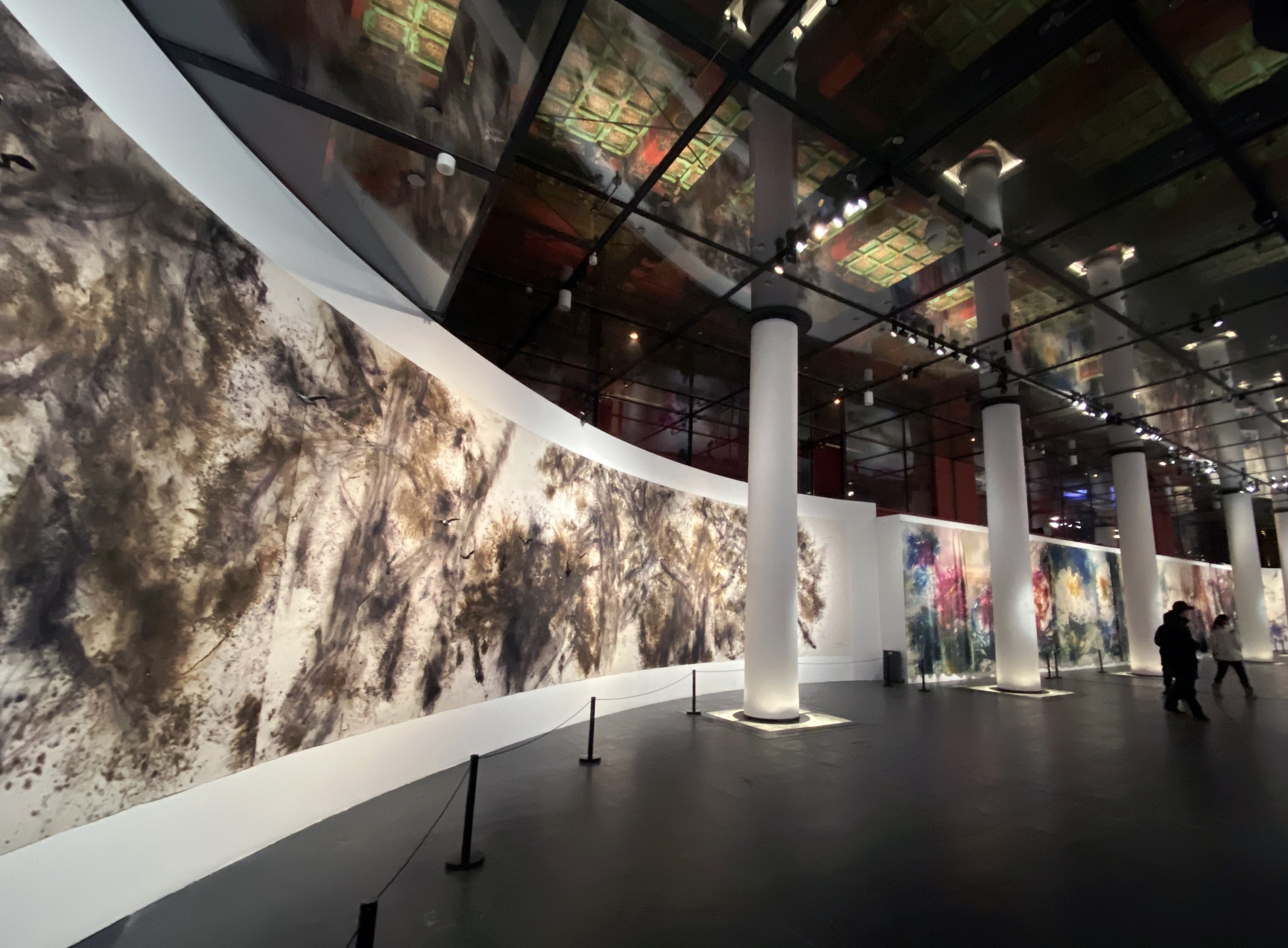 故宫午门正楼展厅集中呈现了蔡国强以“归来”为主题展出的作品。进入展厅,观众首先看到的是其新作《银河嬉冰》。这是他以故宫馆藏《冰嬉图》为灵感、呼应2022年北京冬季奥运会主题的火药作品。这一次,他尝试在大规模的玻璃和镜面上爆破,并特别开发新技法,让玻璃和镜子分别经过几次不同规模爆破,最后上下合并一体,大爆破完成一件完整作品,呈现出在浩瀚银河里溜冰的深邃神奇。爆破后的镜面本身,烟熏出茫茫冰雪的浪漫,也为作品增添了的惊喜。