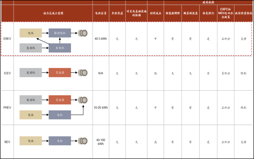 与插电混动相比,增程式拥有完整的电驱动体验。一是插电混动的电池容量更小,插电10-20KWh,理想ONE增程式电动车的电池容量达到40.5KWh。二是插电混动的驱动模式为并联,电池没电之后就是台燃油车。而增程式是串联驱动,即使增程器启动,仍是通过电机(“发动机-发电机-电机”)来驱动车辆,确保电驱车辆更直接的动力响应和无顿挫的驾驶体验。