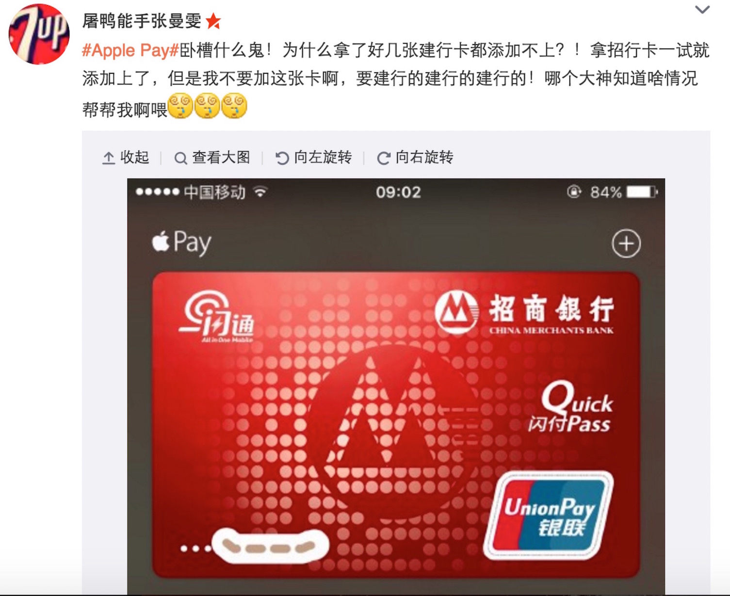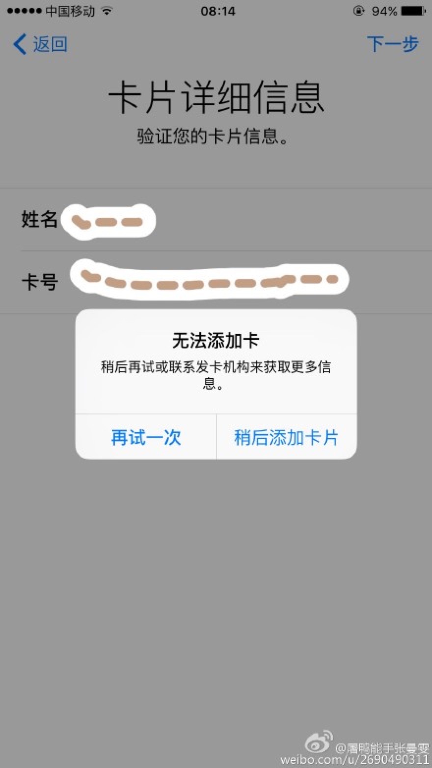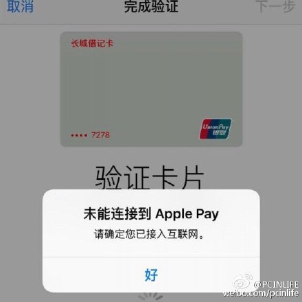 @PCinlife发微博称:“Apple Pay现在加卡出现这个的不要以为是卡不行,是整个中国很多地区的Apple Pay验证服务器挂了,晚些再试吧。或者把地区设为美国,那边没压力,加卡后再改回来。”