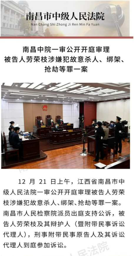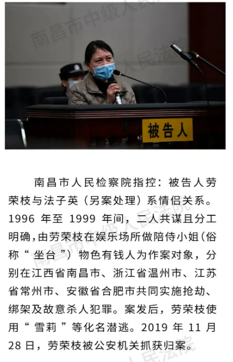 12月21日,据南昌市中级人民法院微信公众号消息,南昌中院一审公开开庭审理被告人劳荣枝涉嫌犯故意杀人、绑架、抢劫等罪一案。南昌市人民检察院指控:被告人劳荣枝与法子英(另案处理)系情侣关系。1996年-1999年间,二人共谋且分工明确,由劳荣枝在娱乐场所做陪侍小姐物色有钱人为作案对象,分别在江西南昌、浙江温州、江苏常州、安徽合肥共同实施抢劫、绑架及故意杀人犯罪。案发后,劳荣枝使用“雪莉”等化名潜逃。2019年11月28日,劳荣枝被公安机关抓获归案。