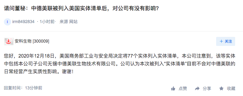 安科生物在互动平台表示,12月18日,美国商务部工业与安全局决定将77个实体列入实体清单,公司注意到,该等实体中包括本公司子公司无锡中德美联生物技术有限公司。公司认为本次被列入“实体清单”目前不会对中德美联的日常经营产生实质性影响。