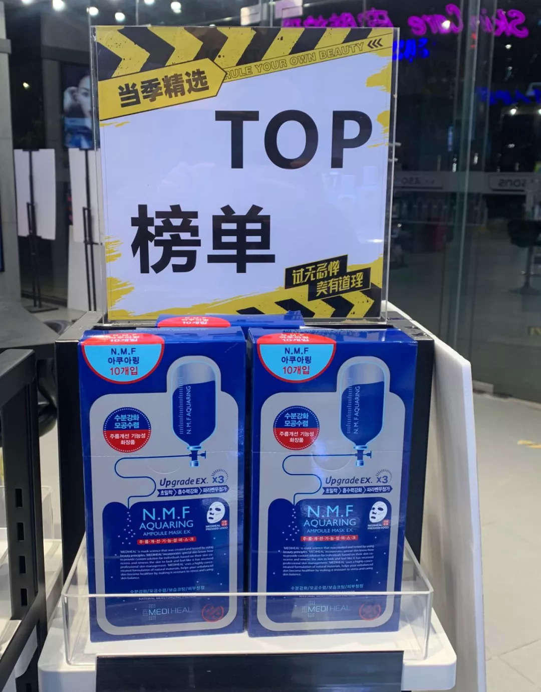 在武汉一家屈臣氏门店正门处,标签为“当季精选 TOP榜单”的产品推荐柜上摆放着美迪惠尔水库针剂面膜。