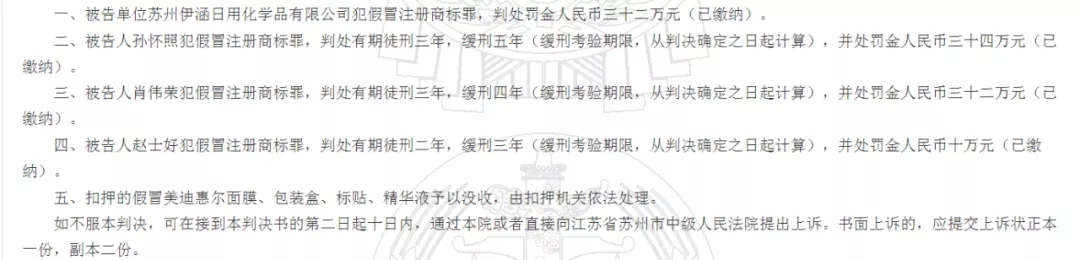 据中国裁判文书网和中国庭审公开网显示,2017年年底至2018年7月期间,被告人孙怀照、肖伟荣、赵士好经事先预谋,在未获得“美迪惠尔”注册商标权利人授权许可的情况下,生产、加工假冒“美迪惠尔面膜”共计9万余片,价值金额共计25.5万元。