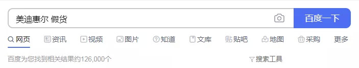 以“美迪惠尔 假货”为关键词在百度检索,共有约12.6万个相关结果。此前,美迪惠尔还因假冒产品含有禁用物质“躺枪”,被国家药监局药监局通报。