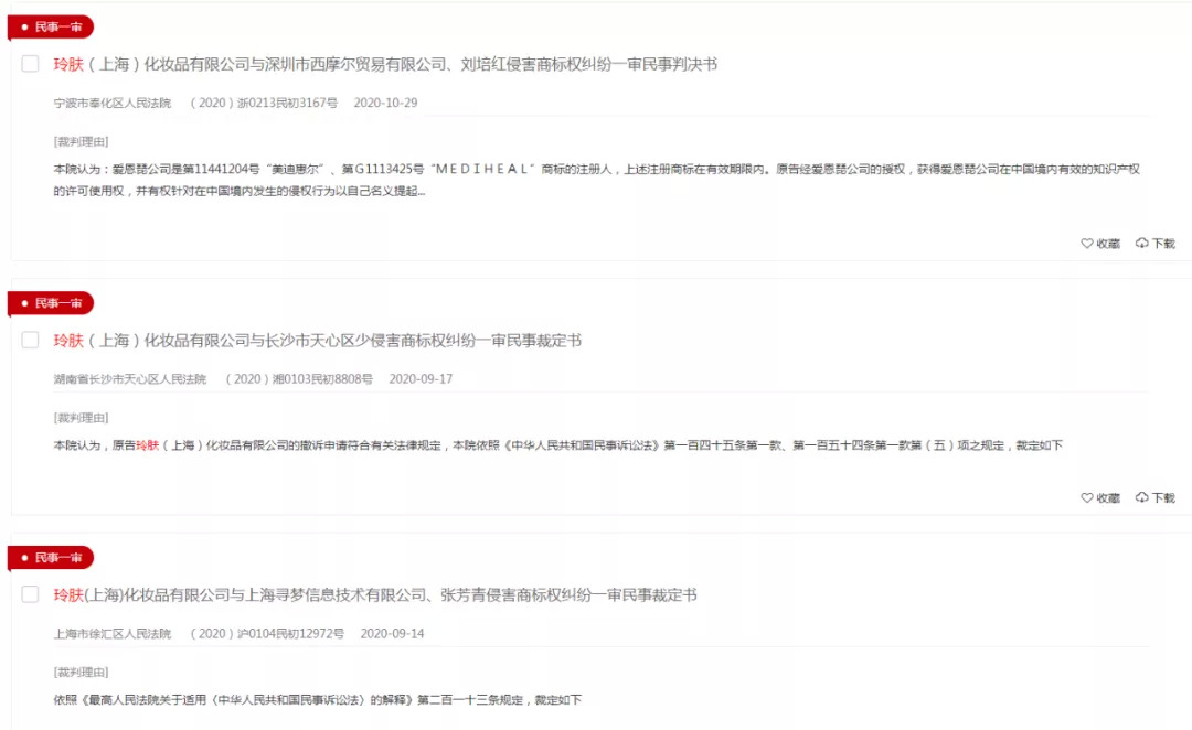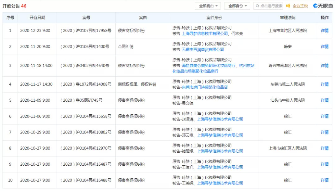 根据中国裁判文书网,青眼统计发现,仅2019年以来,上海玲肤以侵犯商标权为由将广州市越秀区辉发日用品商行、长沙市天心区少女与猫化妆品店等,连同拼多多主体公司上海寻梦信息技术有限公司,共计不下10家实体和网店告上法庭。