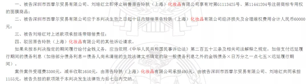 最终,法院认为深圳西摩尔的行为侵犯了上海玲肤注册商标专用权。判决深圳西摩尔及其法人和股东刘培红立即停止销售侵权面膜商品,赔偿上海玲肤经济损失及合理维权费用6万元。