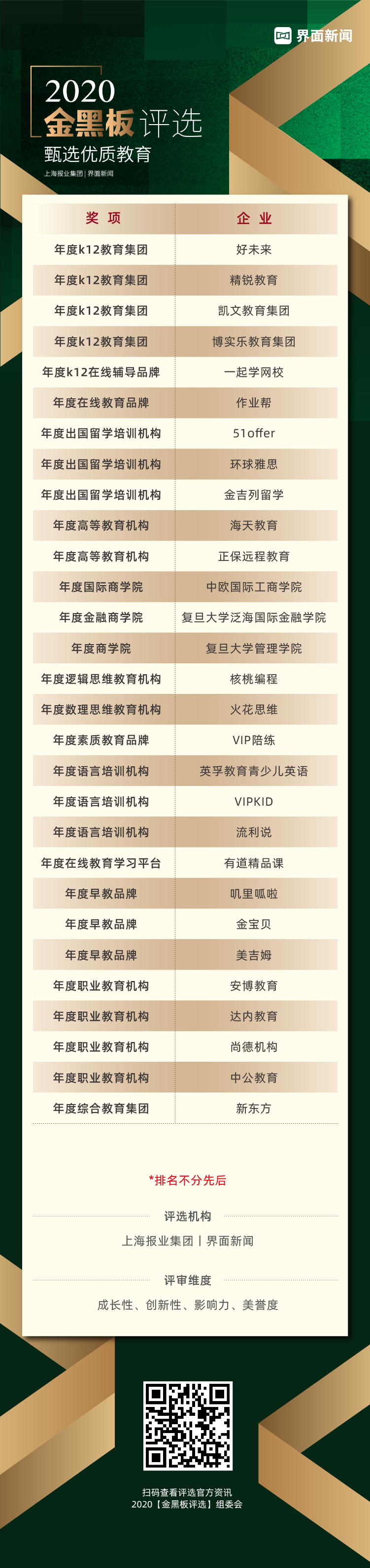 2020【金黑板评选】面向在中国境内开展业务经营的民营教育企业,涵盖K12教育等重点发展领域,甄选优质教育。评选聚焦教育行业的升级和变化,依托教育领域专家、学者、采编,携手专业机构,综合社会各界的意见与建议,通过榜单形式,对在中国境内开展业务经营的优秀教育企业进行表彰。230余家企业经过半年多的激烈角逐,综合桌面调研、数据筛选、自主申报、专家推荐、企业信息调查及大众投票的结果,最终有30家企业以出色表现脱颖而出,斩获大奖。具体名单入下: