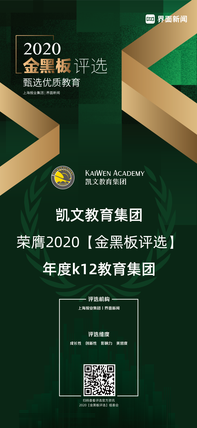 12月23日,上海报业集团l界面新闻揭晓2020【金黑板评选】终榜,正式公布了本年度获奖名单。聚焦教育行业的升级和变化,来自于教育行业的优秀企业,夺得了30项年度大奖。凯文教育集团凭借其良好的经营模式和完整的产业链,荣膺年度k12教育集团。