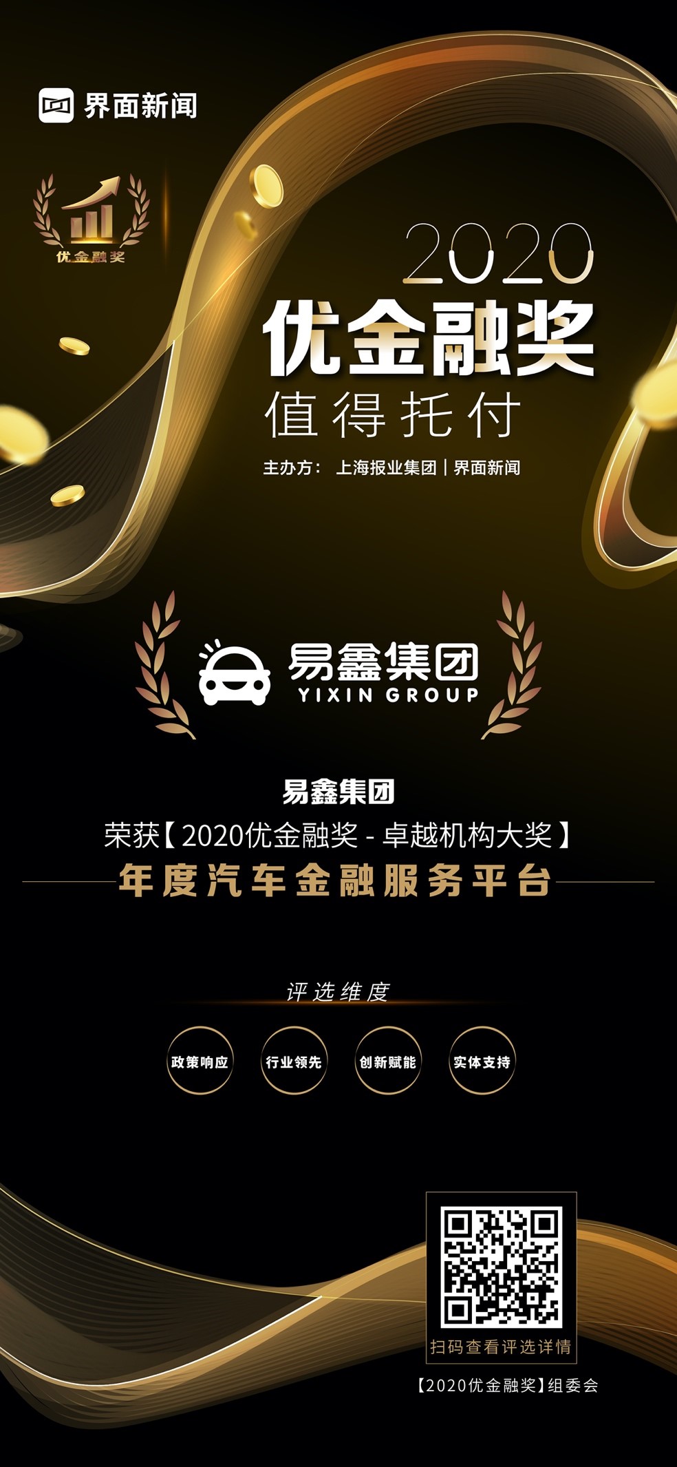 12月23日,上海报业集团l界面新闻在在上海静安瑞吉酒店举办了【2020优金融奖】颁奖典礼,并正式公布了本年度获奖名单。在这项万众期待的金融业年度评选中,来自银行、保险、证券、基金、信托、期货、投资、财管、金融科技的38家金融机构与企业,凭借年度市场表现与行业影响力,获得年度大奖。其中,易鑫集团凭借其在行业内的优异表现,荣膺卓越机构大奖——年度汽车金融服务平台。