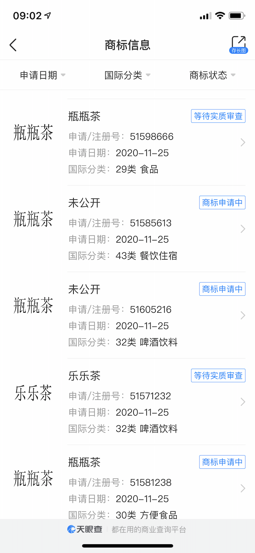 据天眼查APP信息显示,乐乐茶母公司、上海茶田餐饮管理有限公司于近日申请了“快乐茶”“瓶瓶茶”相关商标,注册相关分类包括啤酒饮料、方便食品等。