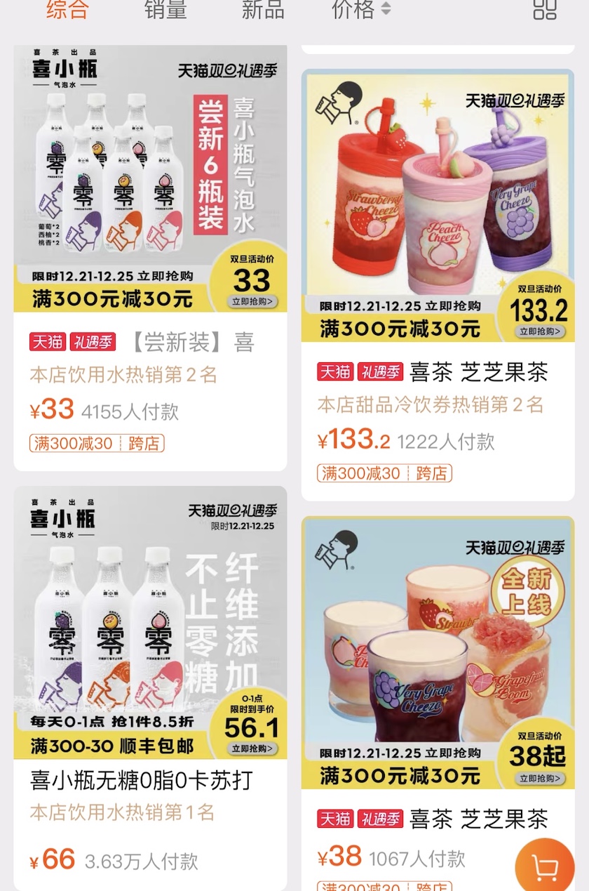 界面新闻在喜茶天猫旗舰店看到,12瓶的喜小茶气泡水套装,售价66元,月销量超1000件,超3.63万人付款。喜茶方面告诉界面新闻,双十一期间,喜小瓶气泡水销量超4万箱、50万瓶;奈雪的茶天猫销售则较为平淡,同样的规格售价,月销量为不到600件。