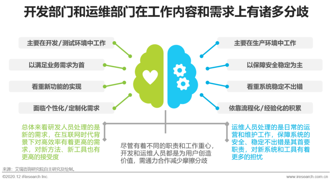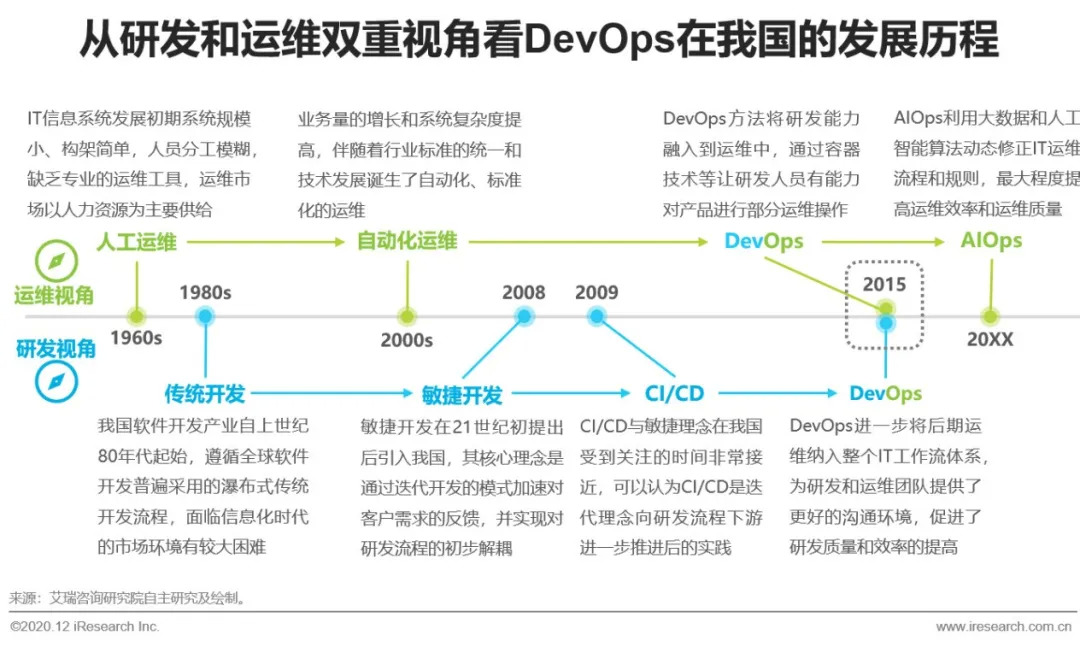 在计算机技术和软件开发行业发展的很长一段时间内研发和运维都处于泾渭分明的关系中,也因此让我们得以从研发和运维两个不同的视角来观察DevOps的诞生。从研发角度来说,以更高的效率交付更有质量的产品始终是研发工程师们的需求;从运维角度而言,全球范围内的计算机运维技术一直以用机器和脚本替代人工运维为目标。而DevOps在2015年前后的普及让IT市场意识到:可以通过将研发和运维环节互相打通、互相融入的方式来减少工作负担、提高工作质量。