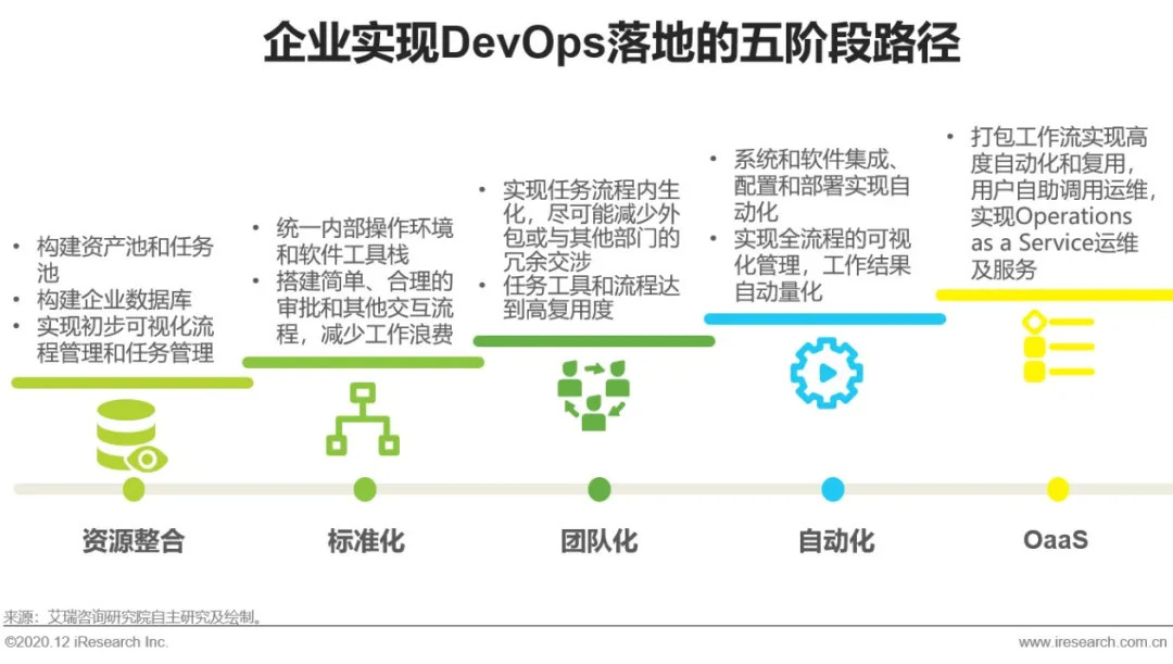 除了企业整体从文化需要面向DevOps的流程与方法进行调整与适应,在实践层面上也需要对IT部门的开发、运维流程进行逐步的改造与升级。这一过程不是一蹴而就的,不同的企业也可以通过不同的路径来打造最适合的自身DevOps方法。一般而言,企业实现DevOps的落地需要经历五个阶段,首先要实现企业内部的资源整合,提高资产和任务的可见性;其次是构建统一、流畅的线上和线下工作环境及流程,接着要搭建能够有效合作的团队体系,加强资源的共享;然后借助一系列信息化的DevOps工具构建企业的自动化开发运维流水线,并生成相应的管理指标体系;当自动化水平发展到一定水平且累计了充足的服务经验后,运维侧即能以标准化的形式为用户提供更高效便捷的服务。