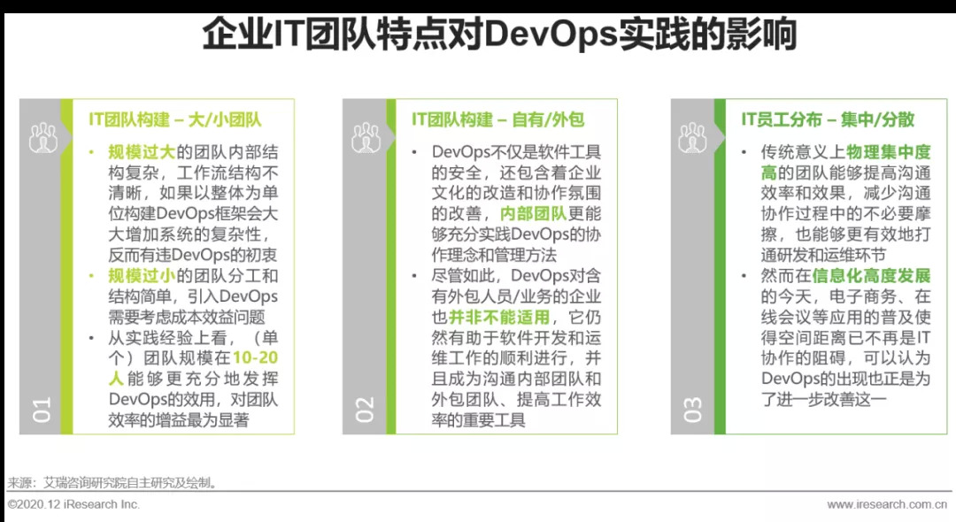 IT团队是DevOps理念和方法最终的实践主体,尽管DevOps对团队属性并没有固化的要求,然而在实践中团队的不同形式对开展DevOps转型可能会有显著的影响,除了无形的团队氛围之外,一些客观条件也可能会影响DevOps转型的效果,本报告着重讨论IT团队的规模,构建方式以及地理集中度对DevOps的影响。我们认为在这之中团队的规模的影响相对显著,过大或者过小的团队规模都会降低的DevOps的增效,在实践中10-20人的(单个)软件团队能够更好地发挥DevOps降本增效的作用;而IT团队是内部团队或是有外包团队、团队人员是否在地理位置上足够集中两方面的要素对DevOps实践的影响并不大,甚至可以认为DevOps的出现就是为了解决当前企业的IT团队无法实现地理上的绝对集中以及完全内化无需外包从而带来的摩擦问题。