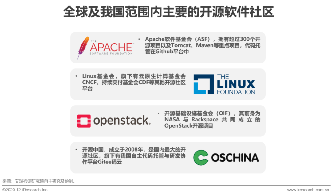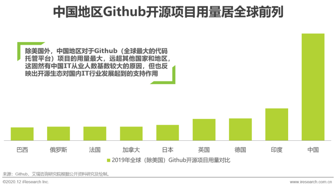 全球范围内开源软件社区上分享的开发和运维工具大大促进了DevOps实践,例如Apache基金会旗下的构建工具Maven、Linux基金会子项目持续交付基金会旗下的集成工具Jenkins、同属Linux基金会的云原生计算基金会旗下的Kubernetes等均已成为受全球开发者广泛认可的DevOps工具。据全球最大的代码托管社区Github统计,2019年中国已成为全球除美国之外最大的开源软件使用地区,相较于2018年中国开发者调用的开源项目增长了48%,显示开源社区的软件工具已成为我国开发者的重要资源,而我国创立的开源中国社区及旗下的Gitee平台近年来也受到越来越多的关注。开源生态的不断充实和发展为开发和运维工程师提供了多样化的工具选择,构筑起DevOps丰富的资源池。