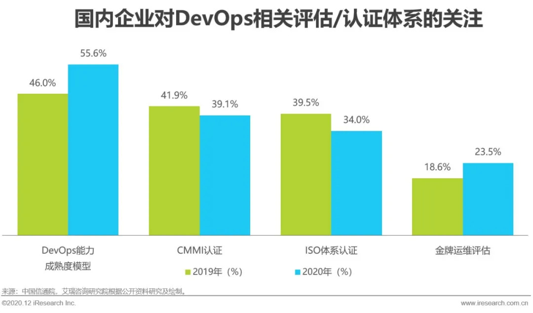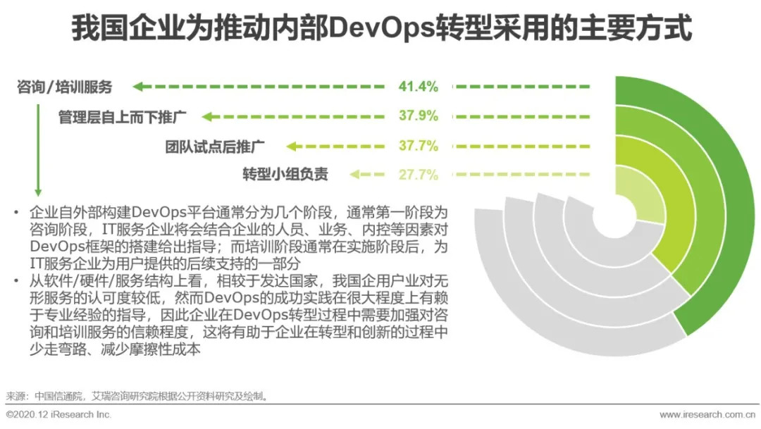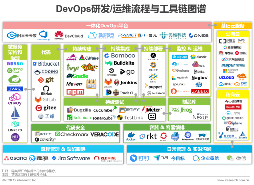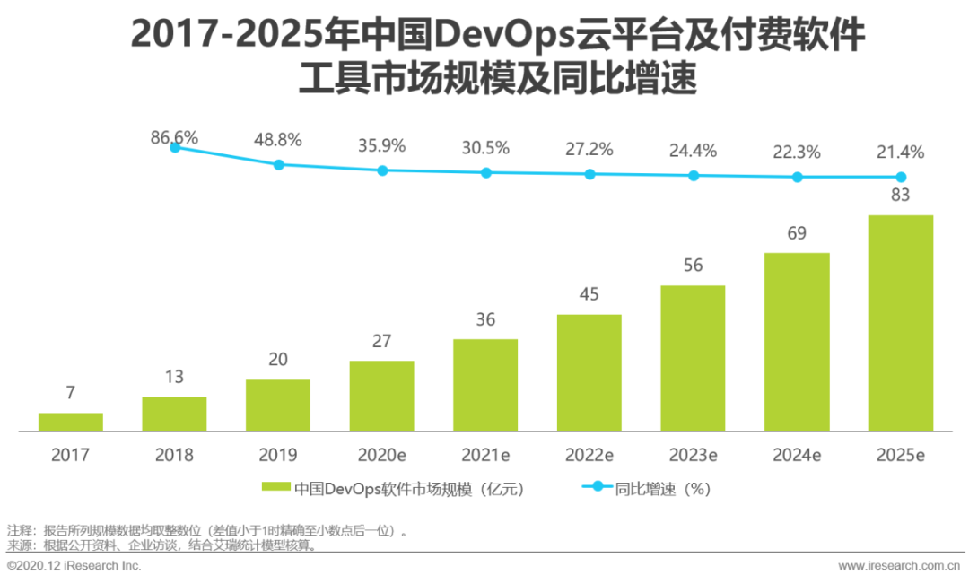 DevOps市场现状:一体化的DevOps平台正在成为全球范围内的DevOps发展趋势,国内企业通常采用一体化平台+开源软件的方式构建自己的DevOps体系。2020年国内DevOps相关产品的市场规模达到27亿元,未来5年的CAGR将超过25%,市场发展前景良好。