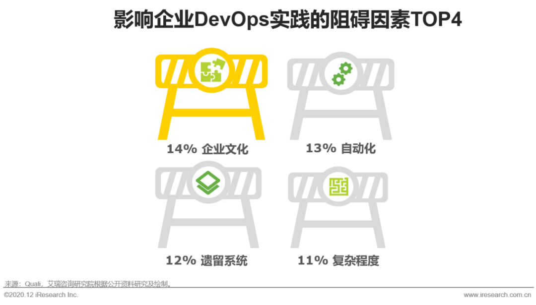 相较于单纯的IT信息化工具,DevOps本身即是一种协同、合作的企业文化,为了落实DevOps实践,企业在采用DevOps相关的开发运维工具的基础上,还要实现文化方面的理念认同。在工作结构方面,IT工程需要在架构和流程上都实现解耦;在协同方法方面,IT团队需要构筑紧密协作、责任共担的合作氛围;在管理思想层面,IT管理层需要落实对部门工作颗粒化、可视化、可量化的考核。美国DevOps平台企业Quali的实践研究表明,在尝试DevOps方法的企业和人员中,认为企业文化缺陷阻碍DevOps发展水平的占最大比重,显示文化因素对企业提高开发运维一体化水平的重要性。