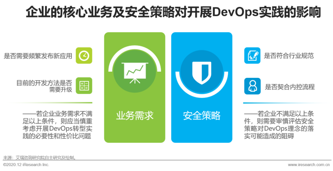 此处我们讨论的是计划将DevOps引入内部IT团队,并服务于母公司的软件需求的企业,而非对外提供软件开发和运维服务的企业。由于互联网经济和电子商务不断向各行各业加速渗透,IT实力越来越成为影响企业运营水平的关键因素,然而并非所有的行业和企业(机构)机构都需要DevOps的加持,其中最核心的影响因素是该企业的业务是否需要频繁发布新的应用来满足用户的需求,如果没有此类的敏捷开发需求,或是目前正在运用的开发方法已经能够满足企业的业务需求,则开展DevOps的转型耗费的资产和管理投入的性价比较低。此外,对于安全策略较为严格的行业和企业而言,虽然DevOps能够在一定程度上与安全审查流程融合,然而其敏态开发的效果将会有所下降。