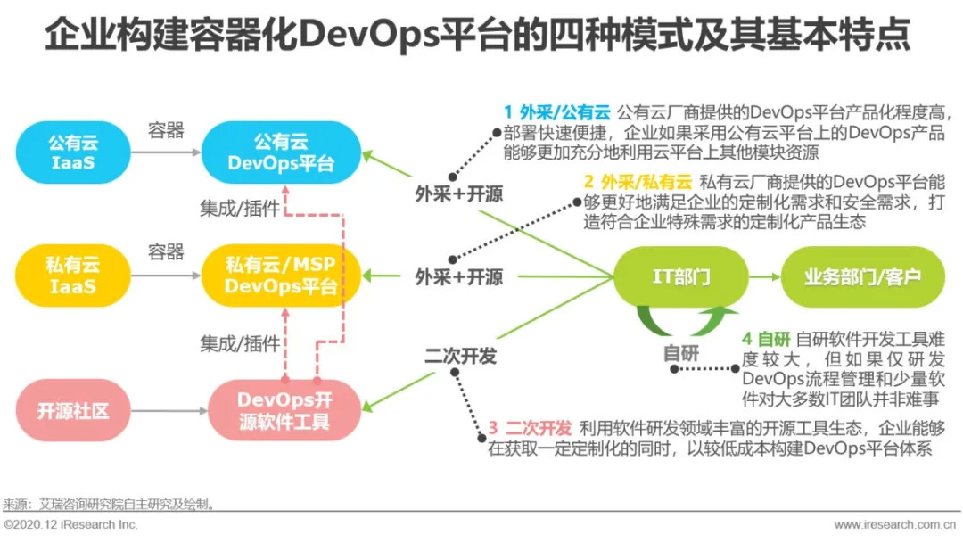企业构建DevOps平台的主要途径有四类,伴随云计算的发展和云平台上产品生态的不断丰富,大量的企业选择从公有云厂商采购其提供的DevOps云平台,而对代码安全和保密性以及定制化要求较高的企业则更倾向于以私有化建设的模式向私有云厂商购买DevOps咨询和平台搭建服务。由于主要国际开源社区如CNCF、Apache均有着了大量涉及DevOps的项目,具备相关专家人才和技术积累的企业也可能选择将主流的版本控制、构建等工具集成为DevOps流水线,能够以较低的成本满足企业基本的开发运维需求。对DevOps流程上各环节所用的软件工具均进行独立的开发再集成为一体化的DevOps平台则是极少数国际IT巨头企业的选择。由于主要开源工具经过多年市场验证广受认可,一般而言可以以插件的形式接入IT厂商提供的DevOps平台,使开发者能继续使用长期以来习惯的工作环境,也是目前国内主流的DevOps构建方法。