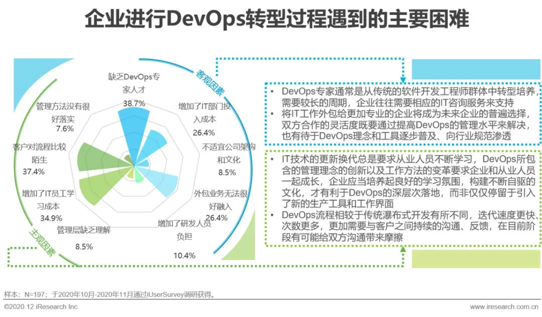 调查显示企业在DevOps转型中遇到的主要困难可以分为客观和主观两方面的因素,其中客观因素主要涵盖由于DevOps理念和方法较传统方式的改变带来的难以避免的企业摩擦性成本,从调研结果来看主要包括企业缺乏DevOps领域的专业人才、外包业务与企业内部DevOps流程的衔接还不流畅以及增加了IT部门的投入;另一方面,主观因素主要涉及软件产业链中的各环节的人员对DevOps理念和方法感到的不适应所产生的压力,主要包括内部IT员工因为学习成本增加而承受的负担,以及企业下游用户对于DevOps方法下工作流程的改变所产生的不适应。解决上述问题不仅需要各家企业内部的努力,还需要软件行业产业链上的各环节共同促进DevOps应用的深化,通过全面的生态融合来消解局部的摩擦。