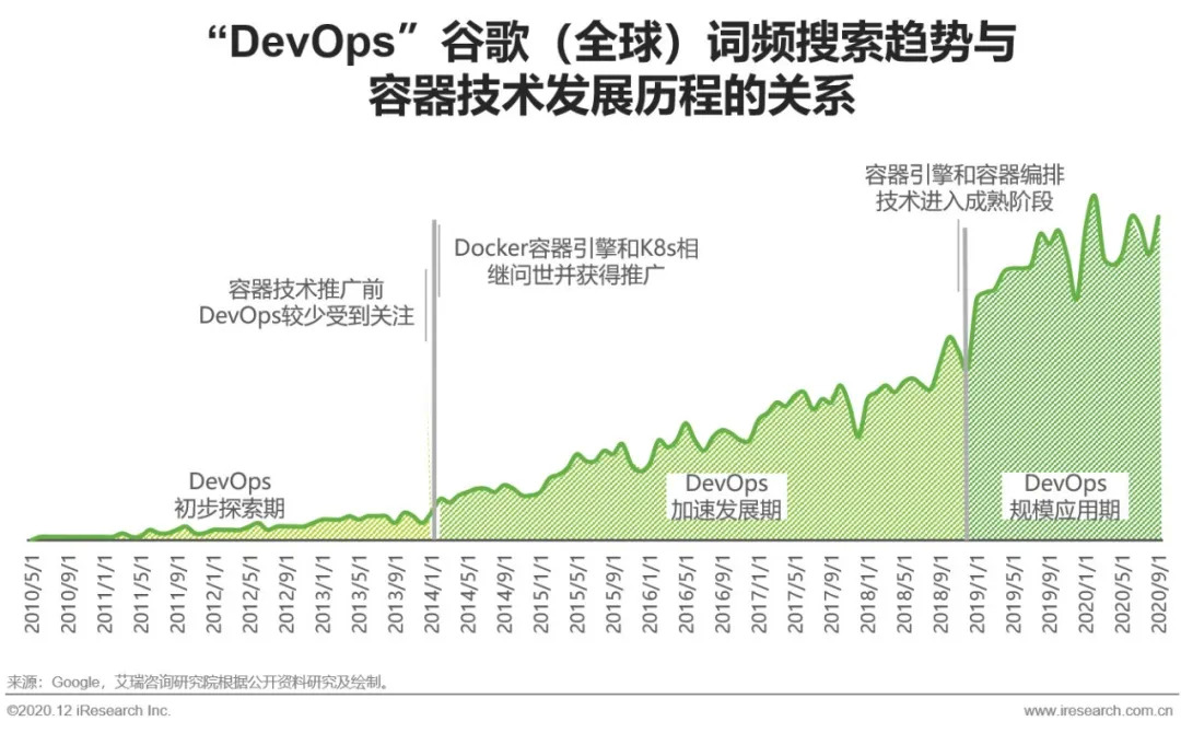 DevOps理念由来已久,其在2009年被正式提出时正是云计算概念获得广泛关注的时间,然而一直以来全球范围内的软件企业虽然有实践DevOps的意愿,却缺乏相应的技术和工具。2013年末Docker容器引擎开源,随后容器编排工具K8s逐步获得市场认可,通过容器镜像对应用程序进行标准化的封装和编排成为软件研发行业新一代的主流架构。容器和微服务架构的天然契合加速了对传统巨石架构的颠覆,软件内部架构的解耦也使得践行DevOps方法和流程成为可能。可以认为docker容器的问世和推广为DevOps的发展打下了技术基础。