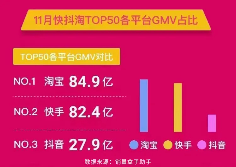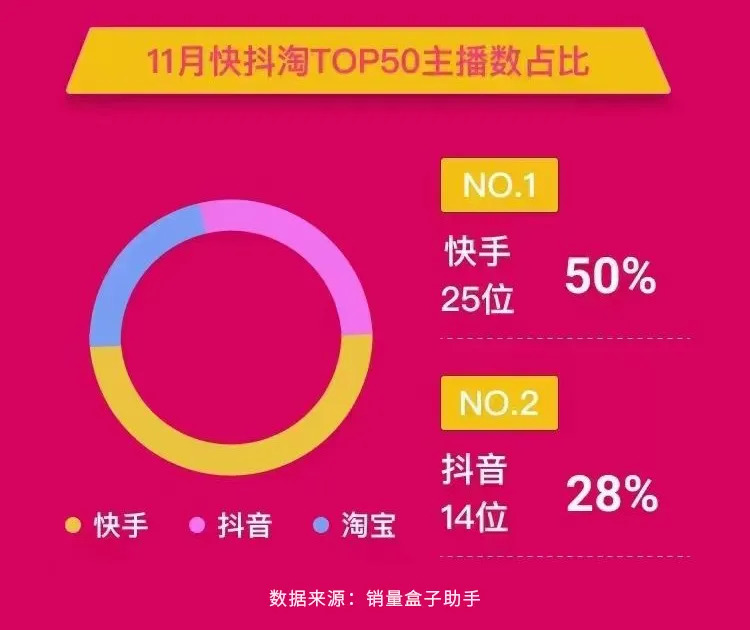 除了实体店直播带货之后,快抖淘的直播带货竞争更加白热化,以刚结束的11月份为例,11月份快抖淘Top50中,快手一共有25位,占比50%,抖音一共14位,占比28%,淘宝以11位列第三。