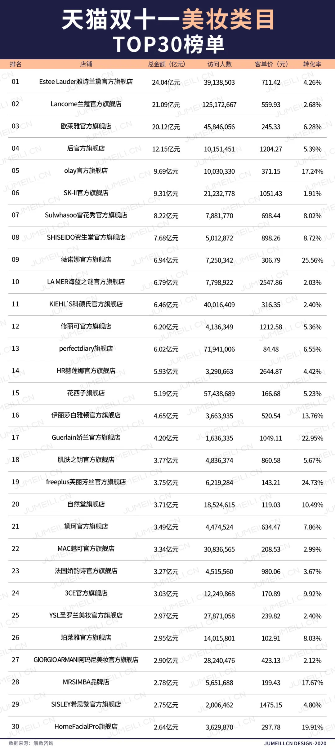 跟去年相比,三巨头欧莱雅、雅诗兰黛、兰蔻三甲地位依然稳固,不过雅诗兰黛去年含恨第三之后,今年终于上位成功,凭借24亿最终销售额力压欧莱雅,成为2020年度双十一美妆冠军。