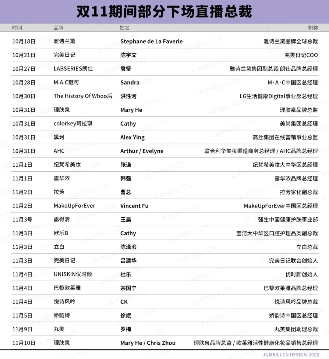 在10月31日晚,理肤泉品牌总监、美尚集团总经理、高丝集团在线营销事业总监、联合利华美妆渠道商务总经理/AHC品牌总经理等多个公司大佬都亲临各自品牌店铺直播间,参与直播带货。