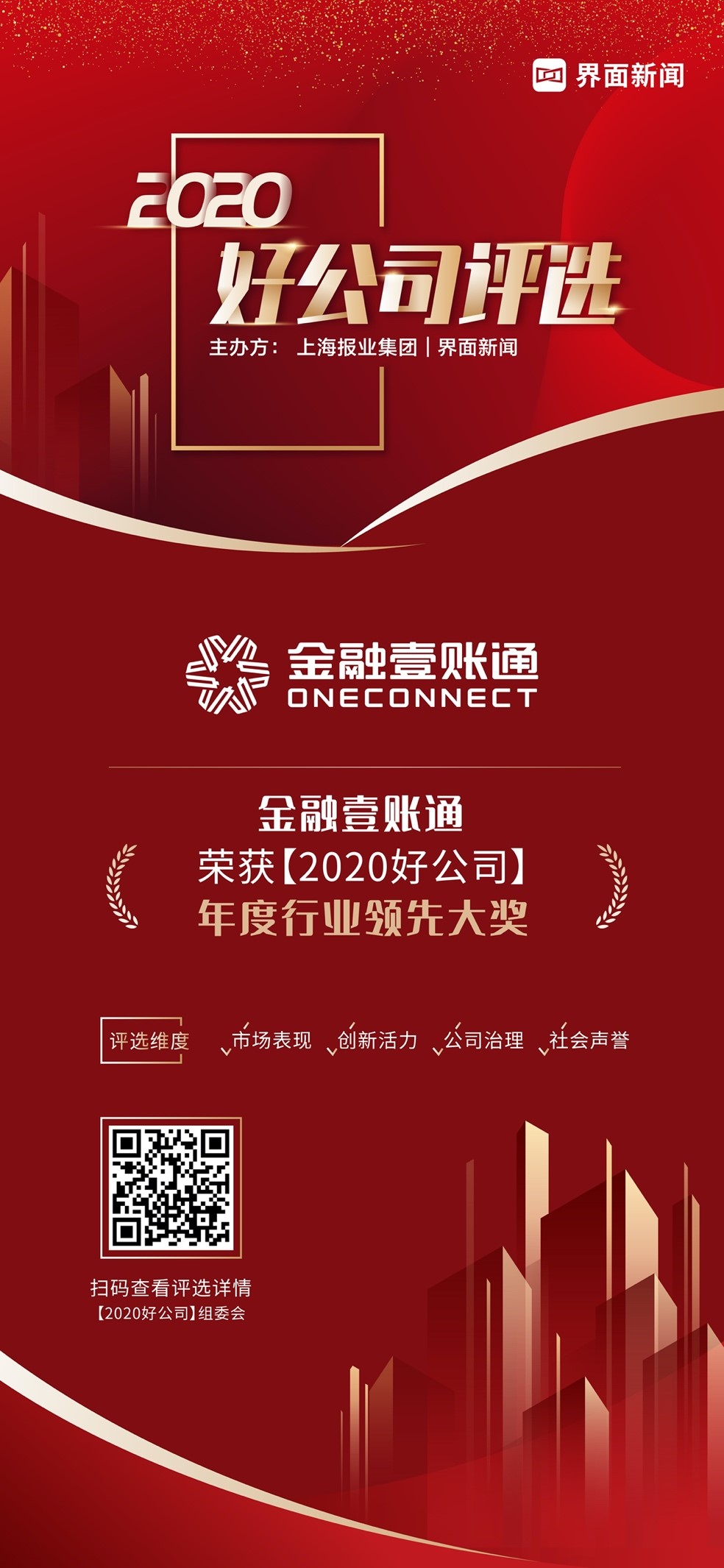 12月23日,上海报业集团l界面新闻在在上海静安瑞吉酒店举办了【2020好公司】颁奖典礼,并正式公布了本年度获奖名单。来自36个细分行业440逾家候选公司,经大众投票统计、市场表现、创新能力、治理体系和社会声誉等方面的角逐,最终54家优质企业突出重围荣登年度荣誉榜单。金融壹账通依托平安集团30余年的金融科技积累,构建庞大的金融科技服务生态圈,荣膺【2020好公司——行业发展大奖】。
