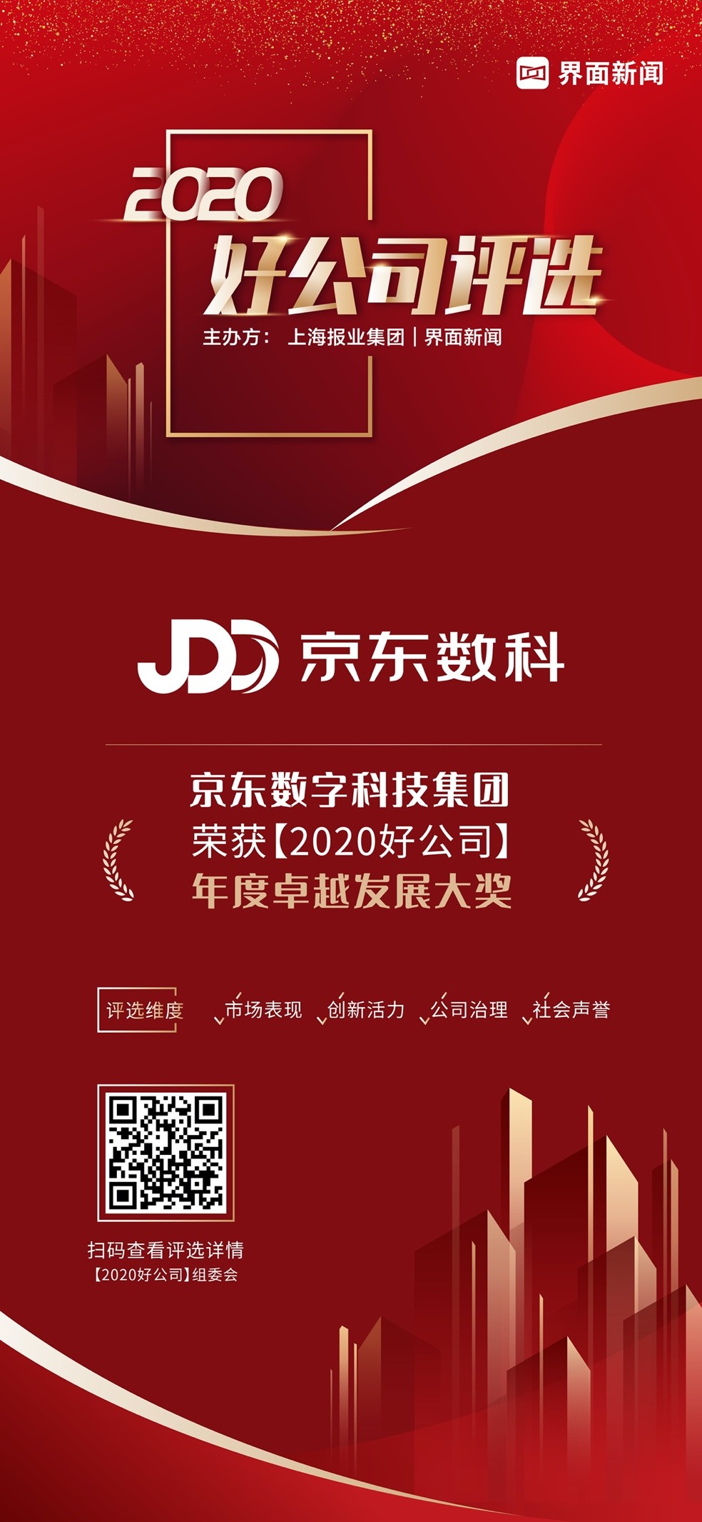 12月23日,上海报业集团l界面新闻在在上海静安瑞吉酒店举办了【2020好公司】颁奖典礼,并正式公布了本年度获奖名单。来自36个细分行业440逾家候选公司,经大众投票统计、市场表现、创新能力、治理体系和社会声誉等方面的角逐,最终54家优质企业突出重围荣登年度荣誉榜单。京东数科以AI驱动产业数字化,创新发展,荣膺【2020好公司——卓越发展大奖】。