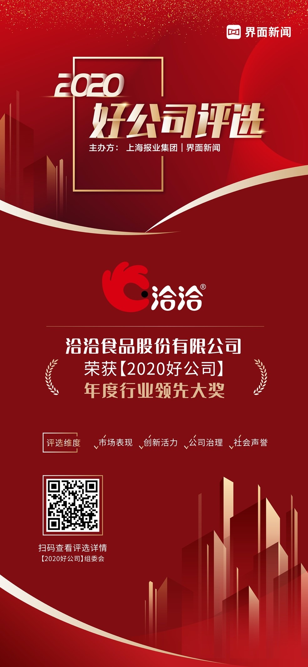 12月23日,上海报业集团l界面新闻在在上海静安瑞吉酒店举办了【2020好公司】颁奖典礼,并正式公布了本年度获奖名单。来自36个细分行业440逾家候选公司,经大众投票统计、市场表现、创新能力、治理体系和社会声誉等方面的角逐,最终54家优质企业突出重围荣登年度荣誉榜单。洽洽食品凭借健全的营销网络,引领中国坚果炒货行业的发展,荣膺【2020好公司——行业领先大奖】。