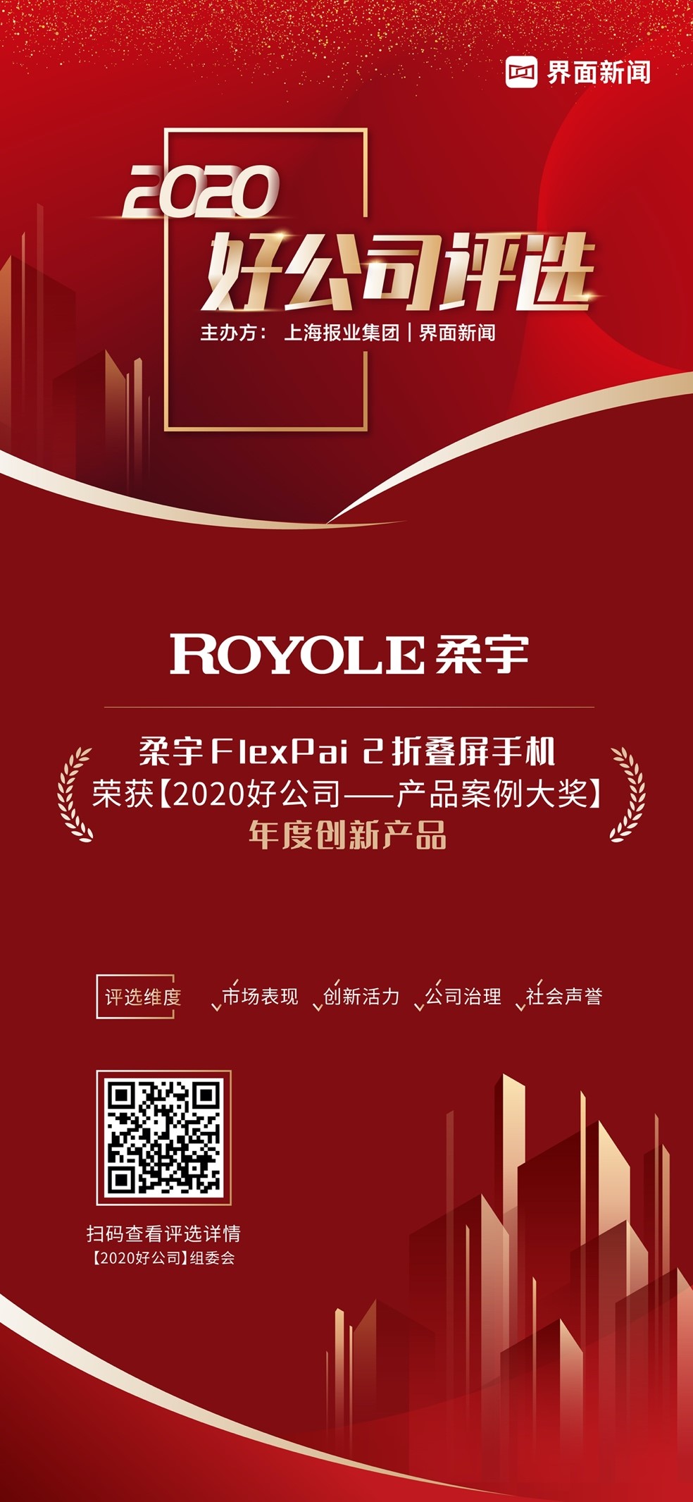 12月23日,上海报业集团l界面新闻在在上海静安瑞吉酒店举办了【2020好公司】颁奖典礼,并正式公布了本年度获奖名单。来自36个细分行业440逾家候选公司,经大众投票统计、市场表现、创新能力、治理体系和社会声誉等方面的角逐,最终54家优质企业突出重围荣登年度荣誉榜单。柔宇FlexPai 2折叠屏手机为全球首款折叠屏手机,领跑手机创新发展之路,荣膺【2020好公司——产品案例大奖】年度创新产品。