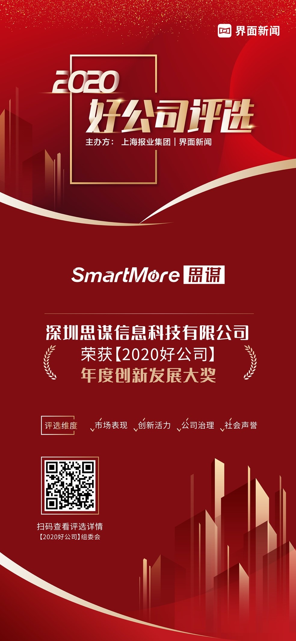 12月23日,上海报业集团l界面新闻在在上海静安瑞吉酒店举办了【2020好公司】颁奖典礼,并正式公布了本年度获奖名单。来自36个细分行业440逾家候选公司,经大众投票统计、市场表现、创新能力、治理体系和社会声誉等方面的角逐,最终54家优质企业突出重围荣登年度荣誉榜单。思谋科技始终致力于AI赋能产业应用,创造了卓越产业价值,荣膺荣膺【2020好公司——创新发展大奖】。