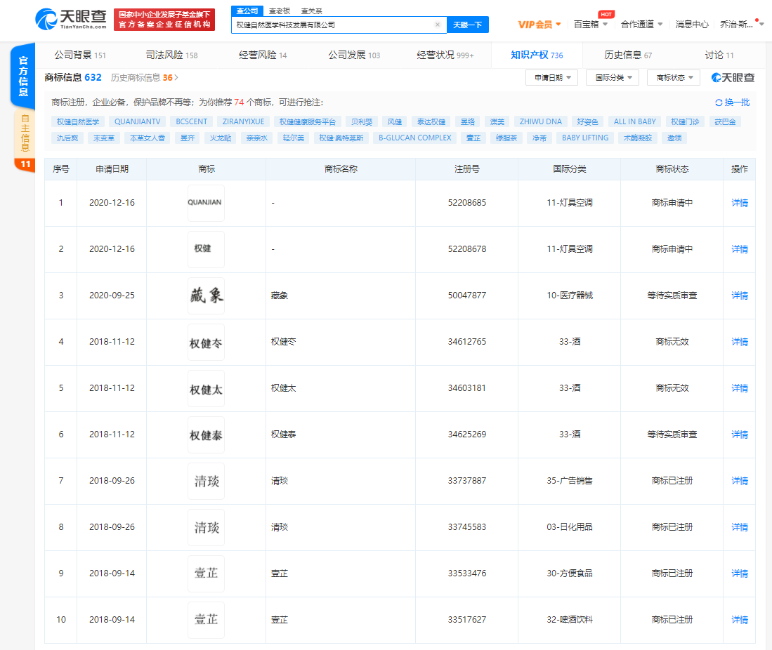 据天眼查APP显示,12月16日,权健自然医学科技发展有限公司新增多条商标信息,其中包含“权健”“quanjian”商标,申请时间在2020年12月,国际分类均为灯具空调,商标状态为“商标申请中”。该公司还曾于2018年申请权健冭、权健太、权健泰等酒类商标,目前状态为“商标无效”或“等待实质审查”。