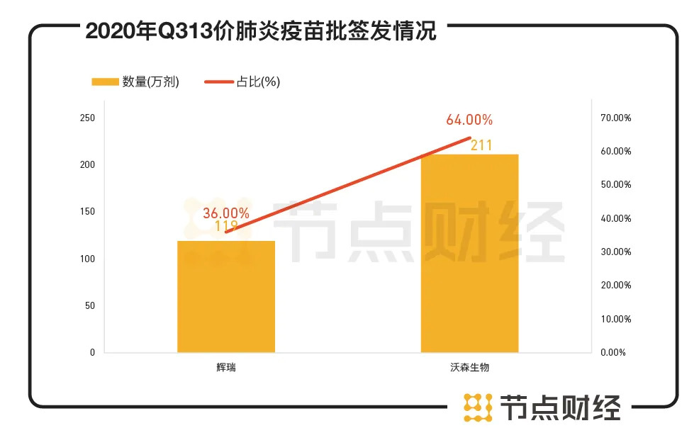 对比海外药企辉瑞的13价肺炎结合疫苗,沃森生物的价格更低(598-556元/剂)、接种年龄层更广泛(6周龄-5周岁),接种剂次更少。天风证券研报数据显示,2020Q3,13价肺炎疫苗批签发330万剂,同比大幅增长177%,其中辉瑞批签发约 119 万剂,占比 36%;沃森生物批签发约211万剂,占比达 64%。
