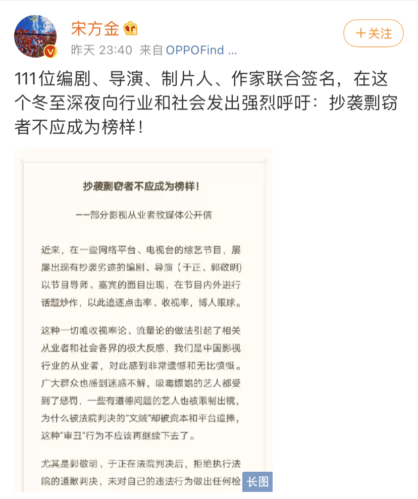 12月21日,宋方金、余飞等人发布111位编剧、导演、制片人、作家的联名信,信中指出,对于曾有抄袭行为的于正、郭敬明频繁出现在综艺节目中进行话题炒作以此博取收视率和点击率的行为,相关从业者感到不耻。信中呼吁不要给抄袭剽窃者提供舞台,应该多宣传德艺双馨的艺术家,尊重原创。联合署名的还有琼瑶、高群书、白一骢、董润年、庄羽等人。于正和郭敬明分别因涉嫌抄袭而与琼瑶和庄羽产生过法律纠纷。