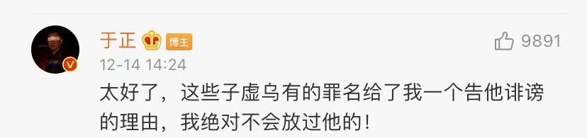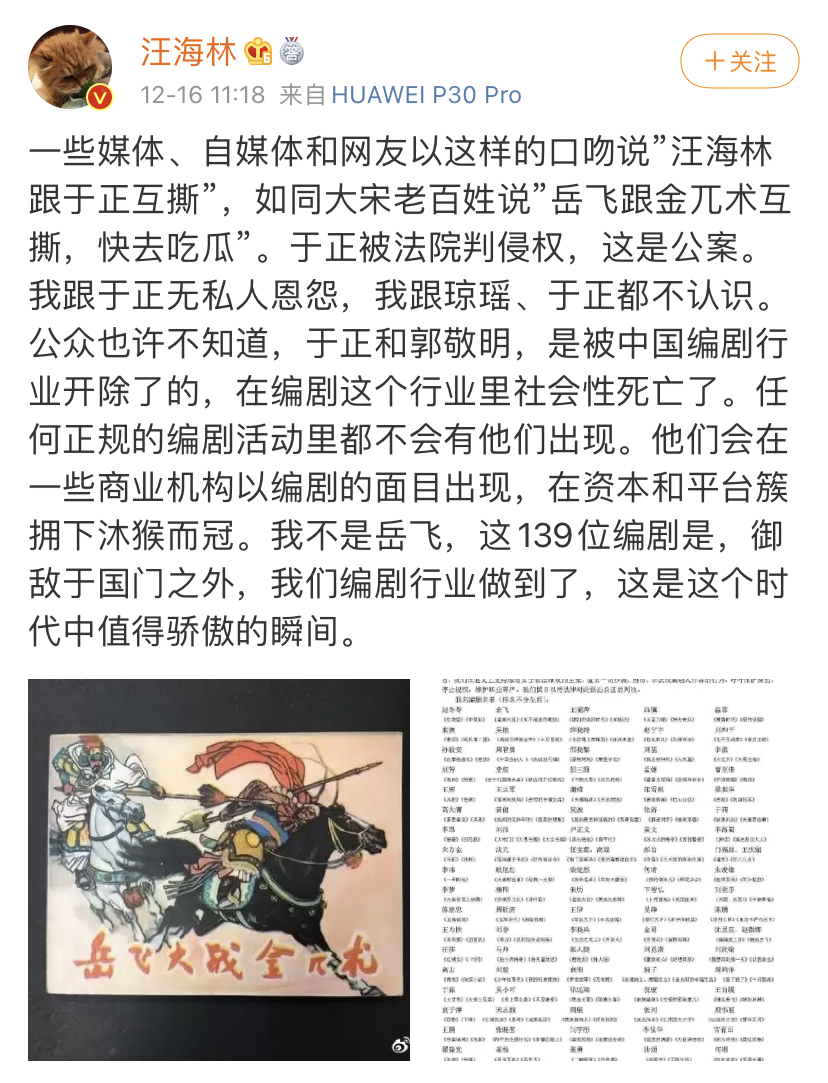 12月16日,汪海林发文表示于正和郭敬明被中国编剧行业开除,并且发布了一百多位编剧联合抵制于正的声明。而于正则认为其他人对自己的攻击是出于嫉妒,并宣称要以“诽谤”状告汪海等人。
