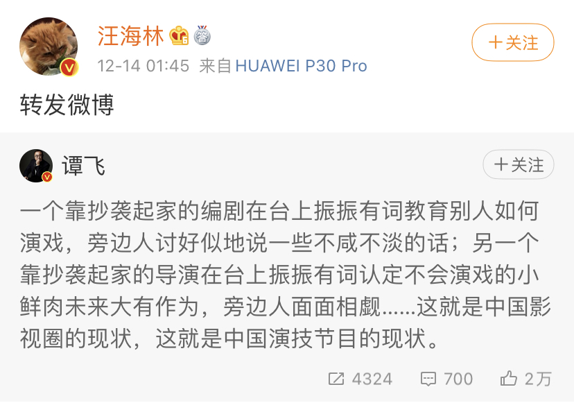 这封公开信是影视从业者对于正和郭敬明不满的一次集中爆发。于正担任导师的《我就是演员》第三季播出后,编剧汪海林通过转发影视投资人谭飞的帖子来表明自己对于正和郭敬明先后以“导师”身份出现在综艺节目中的不满。汪海林、余飞、宋方金、谭飞在节目《毒叔的吃瓜大会》中表示,曾有抄袭行为的人没有资格成为“导师”,更不应该受到追捧和关注。