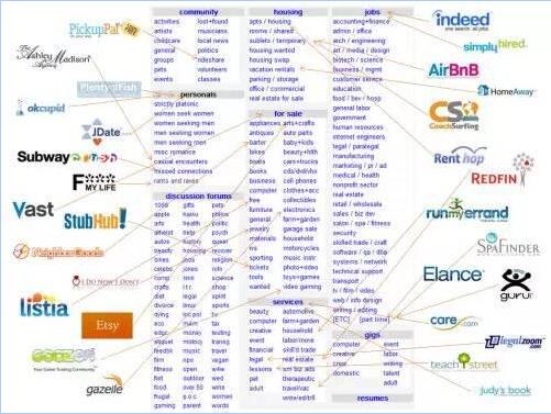 而批评豆瓣的“慢”,就像批评Craigslist的“陋”一样,不仅显得自讨没趣,而且新意渐无。有趣的是,后者的处境与豆瓣有着些许雷同之处,比如下面这张图片,呈现的是Craigslist在移动互联网时代是如何被众多垂直独立App逐步“肢解”的概览: