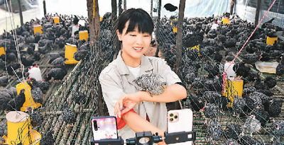 陕西省商洛市丹凤县寺坪镇寺坪村村民李萌在网上介绍自己家养的芦花鸡。新华社记者 刘 潇摄