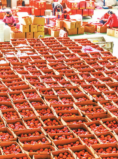 11月1日,山西省临猗县桌逸村果品分拣包装区内,农民正在包装分拣好的出口苹果。姜 桦摄(人民视觉)