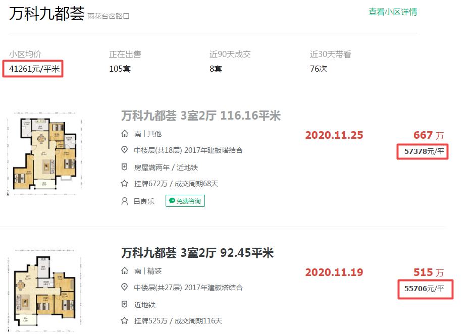 万科九都荟是南站板块最热门的二手房项目了。11月售出的两套二手房均价都已经在5.5万-5.8万/㎡之间了。