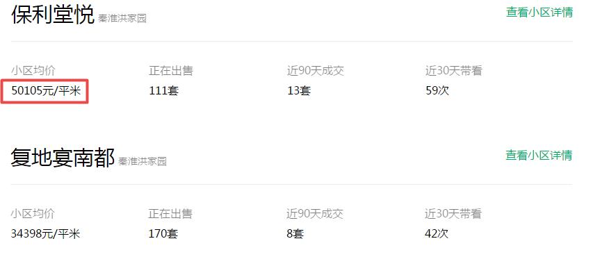 大校场比较受欢迎的次新房项目保利堂悦小区均价已经突破5万/㎡,而相对热度较低的复地宴南都项目尽管二手房均价还未突破3.5万/㎡,但是最近的成交均价已经高达54859元/㎡!
