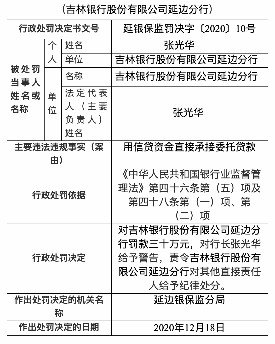 12月22日,延边银保监分局公布的行政处罚信息公开表显示,吉林银行股份有限公司延边分行用信贷资金直接承接委托贷款,延边银保监分局对吉林银行股份有限公司延边分行罚款三十万元,对行长张光华给予警告,责令吉林银行股份有限公司延边分行对其他直接责任人给予纪律处分。
