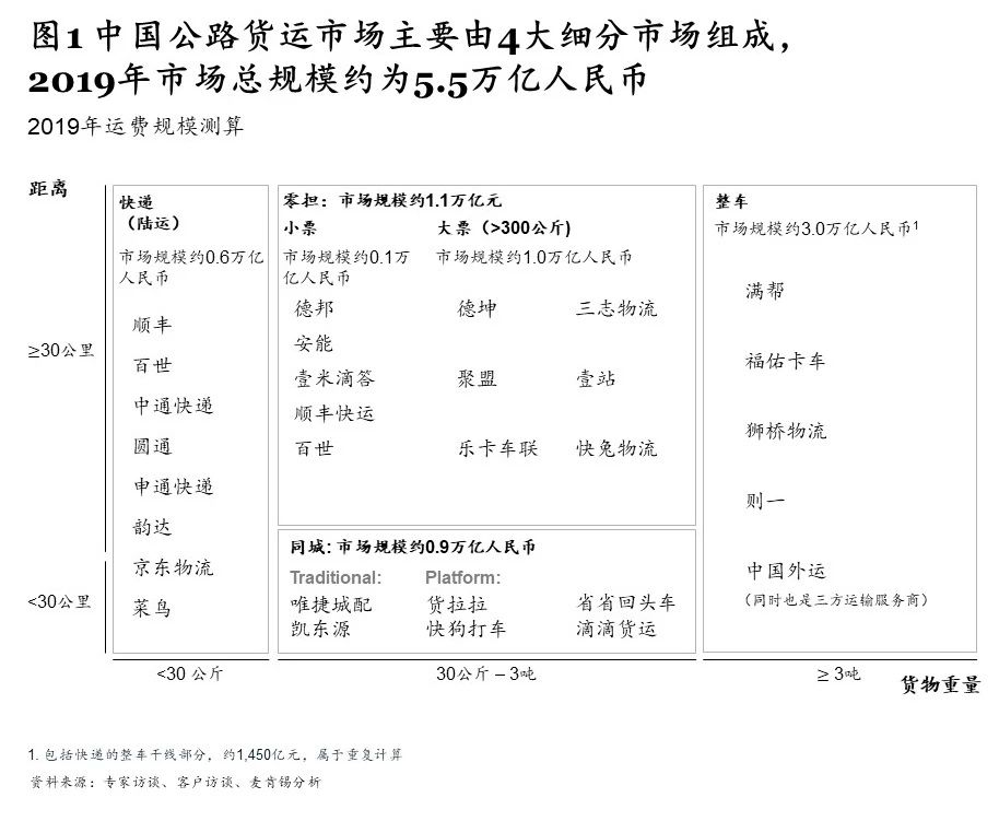 据麦肯锡近日发布的报告显示,公路货运在我国有着极其重要的地位,占货运总周转量的38%。按细分市场可分为快递、快运、区域零担、大票零担、整车及城配等六大板块,市场总规模约为5.5万亿元,其中同城运输体量约有0.9万亿元。