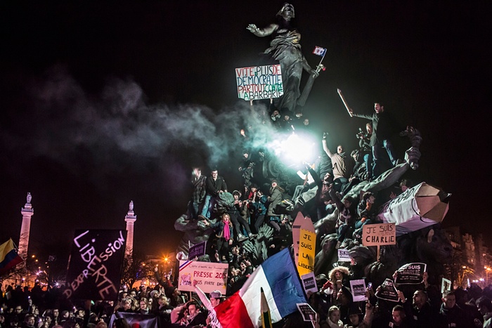 热点新闻类单幅一等奖,在查理周刊袭击事件过后,巴黎人上街游行反对恐怖主义。Corentin Fohlen 摄