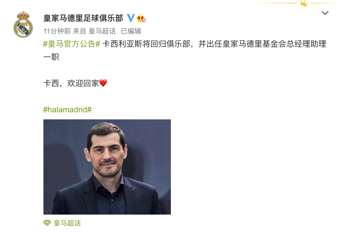 12月22日,西甲球队皇马通过@皇家马德里足球俱乐部 微博宣布,卡西利亚斯将回归俱乐部,并出任皇家马德里基金会总经理助理一职。