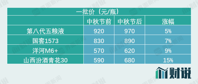白酒市场的涨价往往是自上而下的。第八代五粮液出厂价格在中秋节后已每瓶上涨50元左右,五粮液未来也推出更高端产品,冲击飞天茅台消费市场;泸州老窖旗下核心单品国窖1573出厂价格在中秋节节后也已上涨60元/瓶,旗下其他中高端产品将上涨70元至150元不等。需要指出的是,这是头部酒企旗下高端产品今年来的第二轮涨价。此前的端午节,部分白酒产品已经掀起第一轮涨价潮。